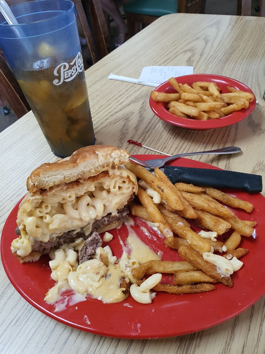 First time coming here after hearing the great buzz about the good food. The iced tea is great and I got the Sweet Heat burger. The burger has a crispy fried macaroni ball in it thats awesome with the burger and cheese with a nice habanero bite. And the server decided she wanted me to have more fries and brought that bowl of fries. Good job My Place Eatery